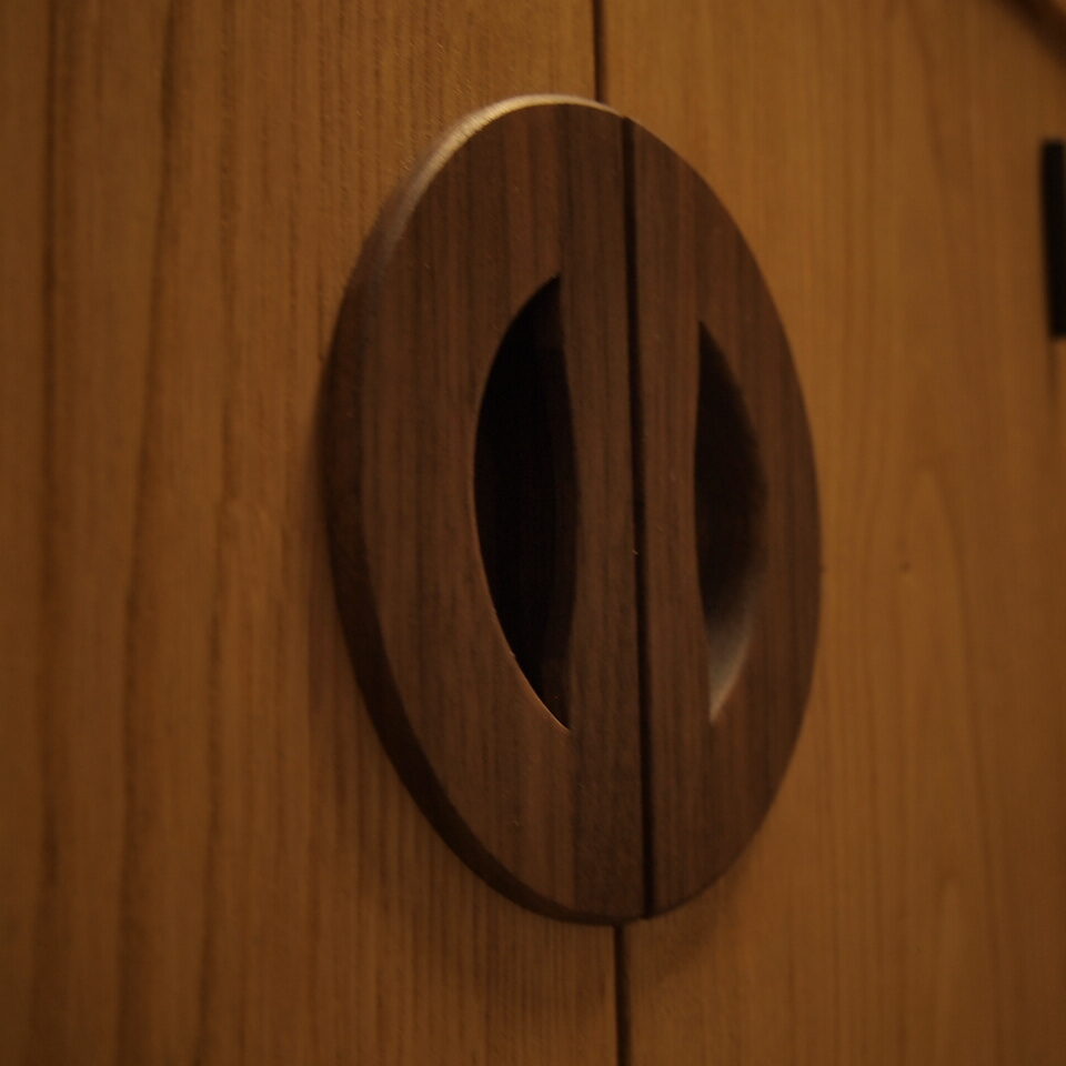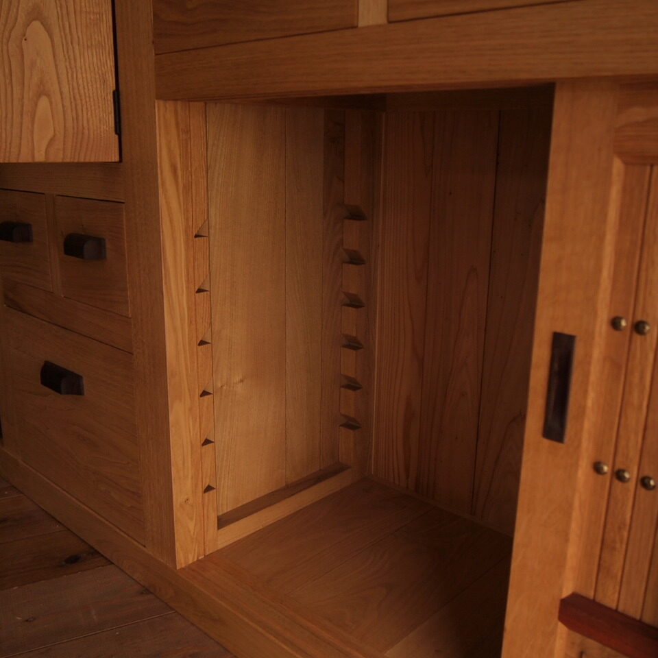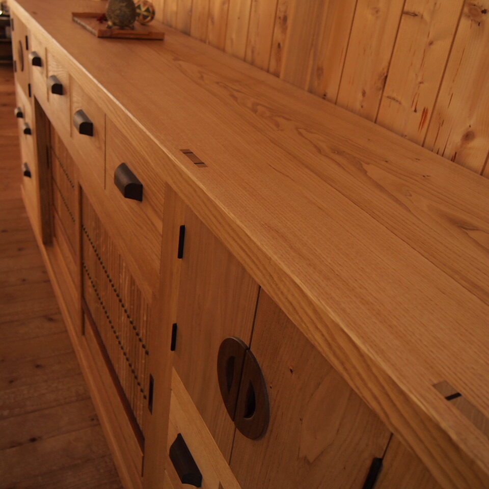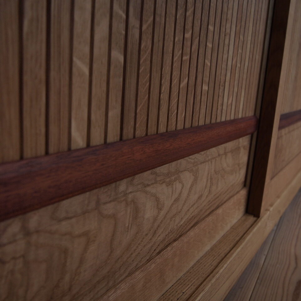 - 材料:クリ、他ホワイトオーク、サティーネ(中央引き戸)、紫タガヤサン(取手)、スギ(背板)